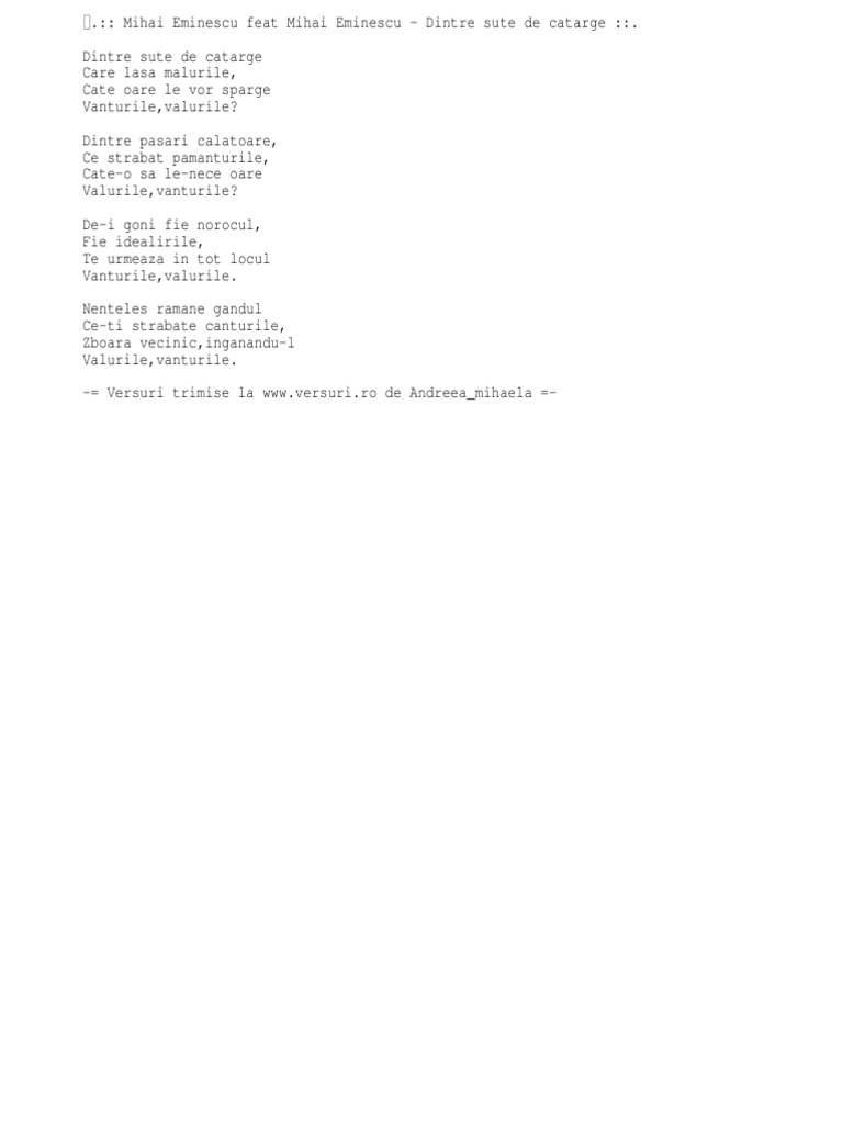 Dintre sute de catarge versuri. 50 videos play all mix pro musica dintre sute de catarge youtube florin bogardo dintre sute de catarge duration. Mai am un singur dor romante pe versuri de mihai eminescu cd 2 dintre sute de catarge voce. Valentin sgarcea duration. Dintre sute de catarge care lasa malurile cate oare le vor sparge.