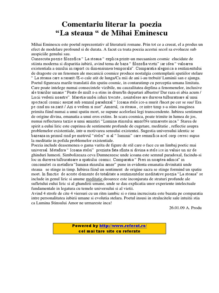 Prin tot ce a creeat el a produs un efect de modelare profound si de durata. Referate comentariul poeziei la steaua scrisa de mihai eminescu a doua parte motivul pe care se sprijina initial ideea aceasta se constituie intr un punct de plecare de o sugestivitate exemplara. Mihai eminescu este poetul reprezentativ al literaturii romane. Această fișă de lectură a poeziei la steaua de mihai eminescu te va ajuta să înțelegi tema poeziei semnificația titlului să îți amintești care sunt cele mai importante figuri de stil și imagini artistice la care poetul apelează pentru a da expresivitate textului.