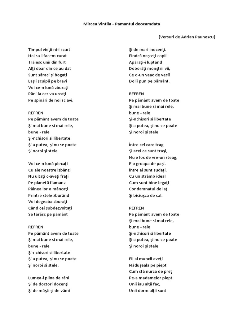 Refren pe pământ avem de toate şi mai bune si mai rele bune rele şi nchisori si libertate şi a putea şi nu se poate şi noroi şi stele între cei care trag şi acei ce sunt traşi nu e loc de vre un steag e o groapa de paşi. El e calea adevărul.