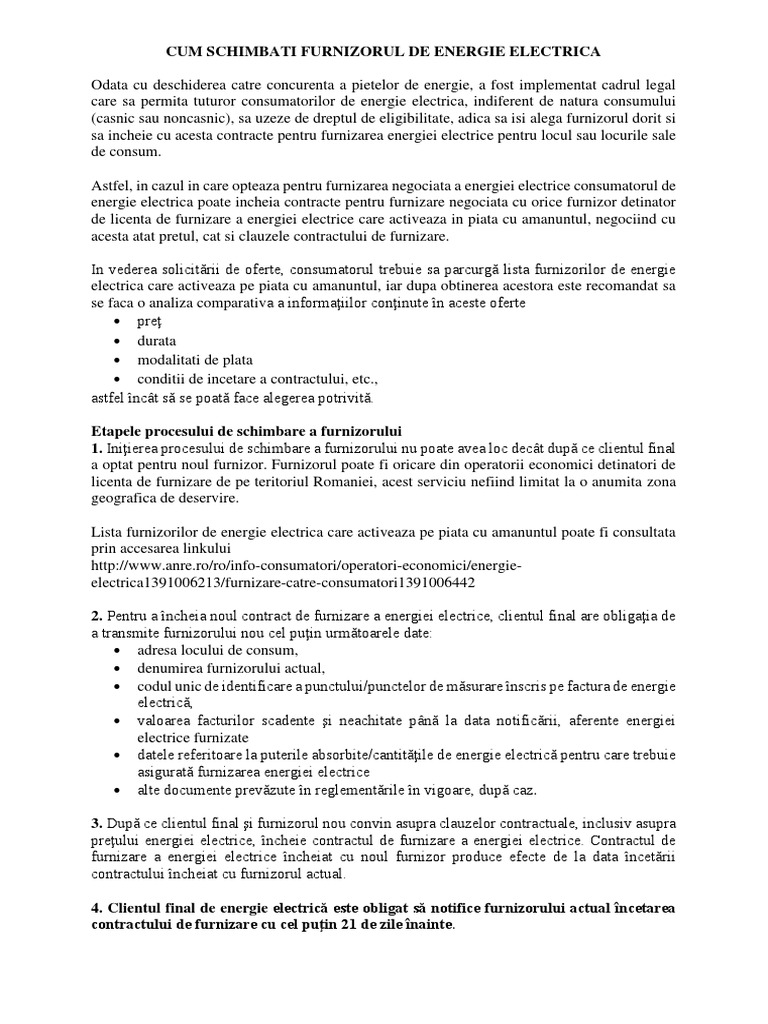 Pentru a schimba furnizorul de energie trebuie in primul rand sa contactezi alti furnizori de energie electrica. Schimbarea furnizorului de energie electrică de către clientul final se face în conformitate cu ordinul anre nr. Acestea vor dispărea peste trei luni de la 1 ianuarie 2021 odată cu liberalizarea pieței de energie electrică. Astfel in cazul in care opteaza pentru furnizarea negociata a energiei electrice consumatorul casnic de energie electrica poate incheia contracte pentru furnizare negociata cu orice furnizor detinator de licenta de furnizare a energiei electrice care activeaza in piata cu amanuntul negociind cu acesta atat pretul cat si clauzele contractului.
